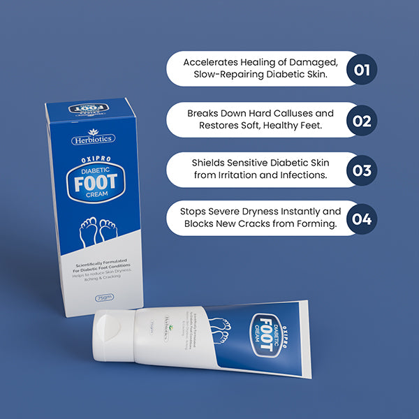 Herbiotics Oxipro Diabetic Foot Cream is specially formulated for diabetic patients to reduce foot problems and promote healthy, comfortable feet. This advanced cream protects against sores, cracks, foot ulcers, and infections, while relieving nerve-related issues such as numbness, tingling, burning, pain, and swelling. Its unique formula also improves blood flow and circulation, supporting nerves and speeding up skin healing, while keeping your feet soft, healthy, and resistant to dryness and irritation.